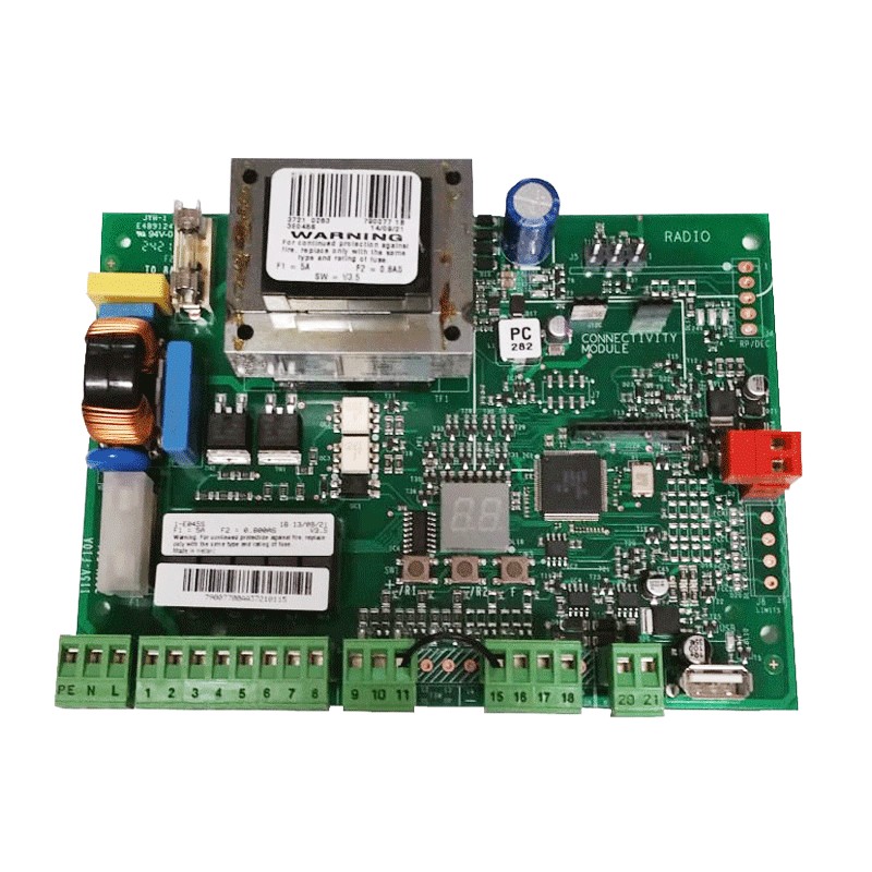 Scheda elettronica E045S Faac per automazioni a battente. Può comandare uno o due operatori.