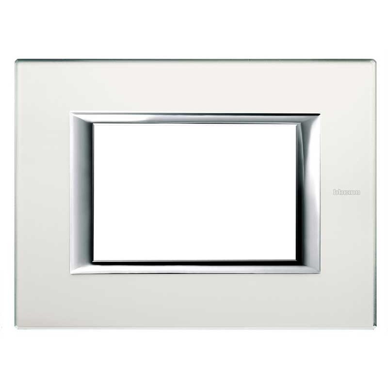 Placca quadra 3 posti Bticino Axolute per supporto H4703. Colore Specchio Acidato. Non è possibile installare la placca su altre serie Bticino ma solo su serie Axolute.