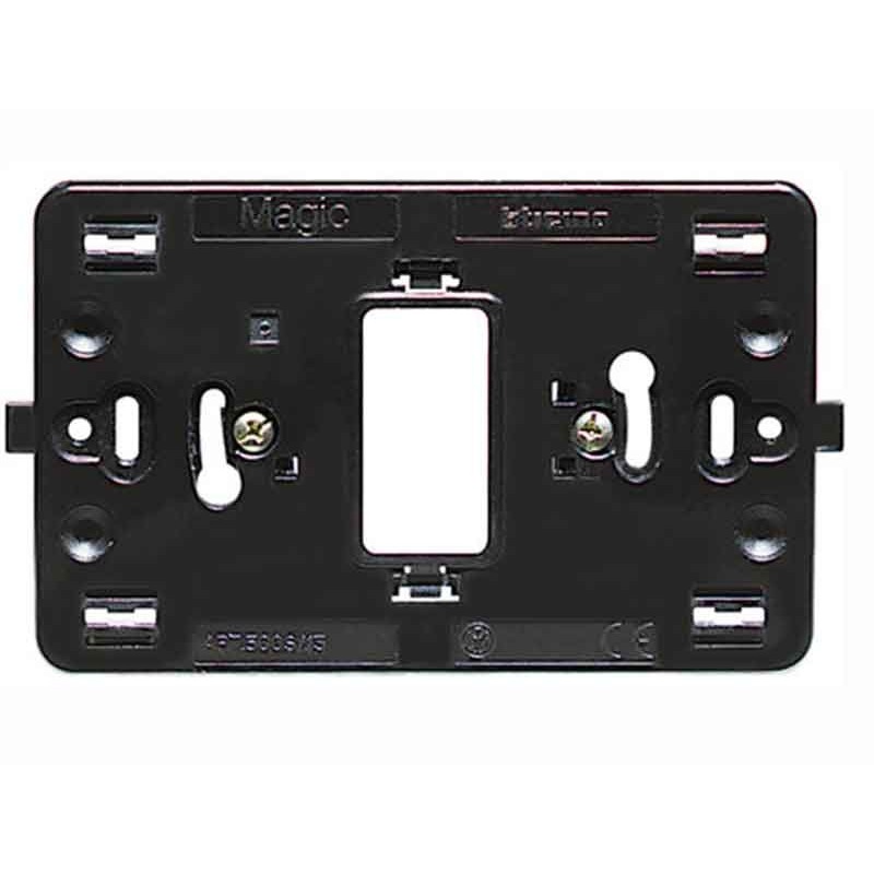 Supporto 1 posto (modulo) Bticino Magic. Può essere fissato con graffette oppure con viti, prevede il montaggio sulla scatola da incasso tonda oppure quadrata.