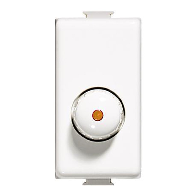 Dimmer a manopola Bticino Matix bianco. Il dimmer serve per regolare l'intensità delle luci a incandescenza (No LED o risparmio energetico tipo neon). Fusibile incorporato.