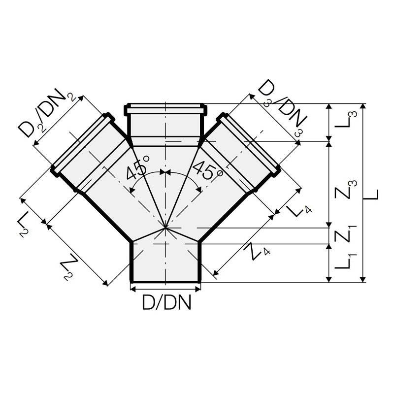 Braga doppia 45 gradi in PP Valsir Triplus a innesto D 110/110/110 mm VS0650655