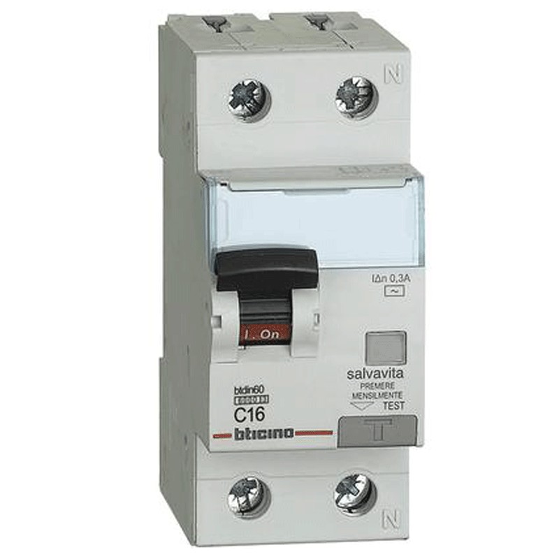 Interruttore magnetotermico differenziale Bticino, 2 moduli, attacco DIN (universale per qualsiasi centralino in commercio), poli 1P+N, 16 ampere, potere di interruzione 6kA, tensione 230 Vac, corrente differenziale Idn 0.3A, tipo AC, curva d'intervento C.