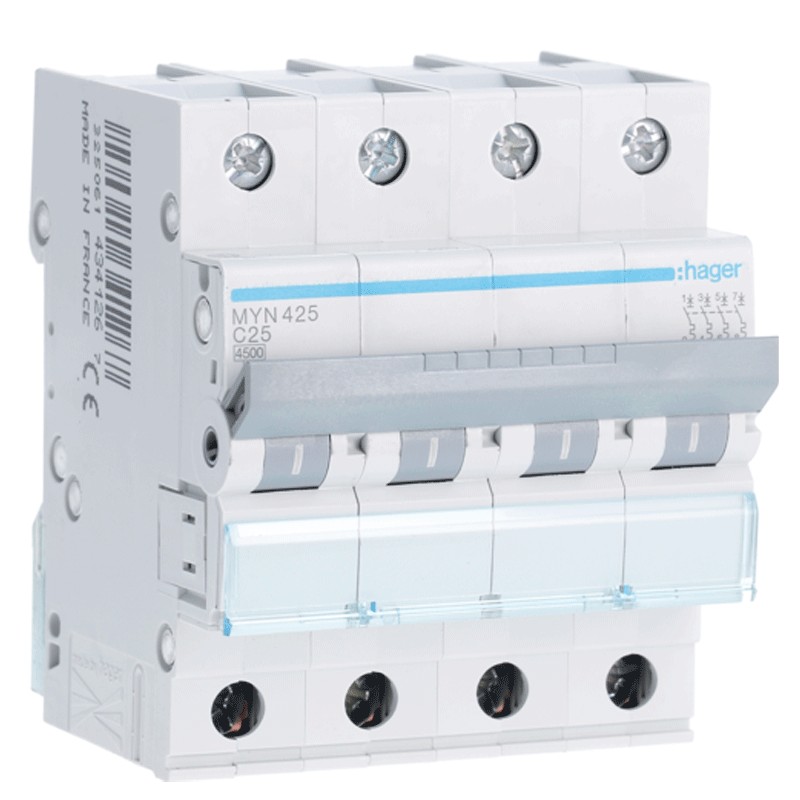 Interruttore magnetotermico Hager 4P 25A 4,5KA C 4 moduli MYN425
