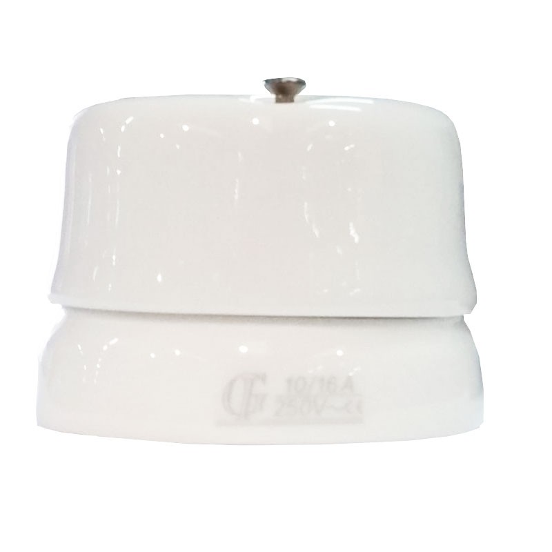 Presa bipasso 16A 250V Gambarelli, in porcellana tipo sporgente ,colore bianco. Viene usato per gli impianti elettrici, con cavo treccia anticata esterno.