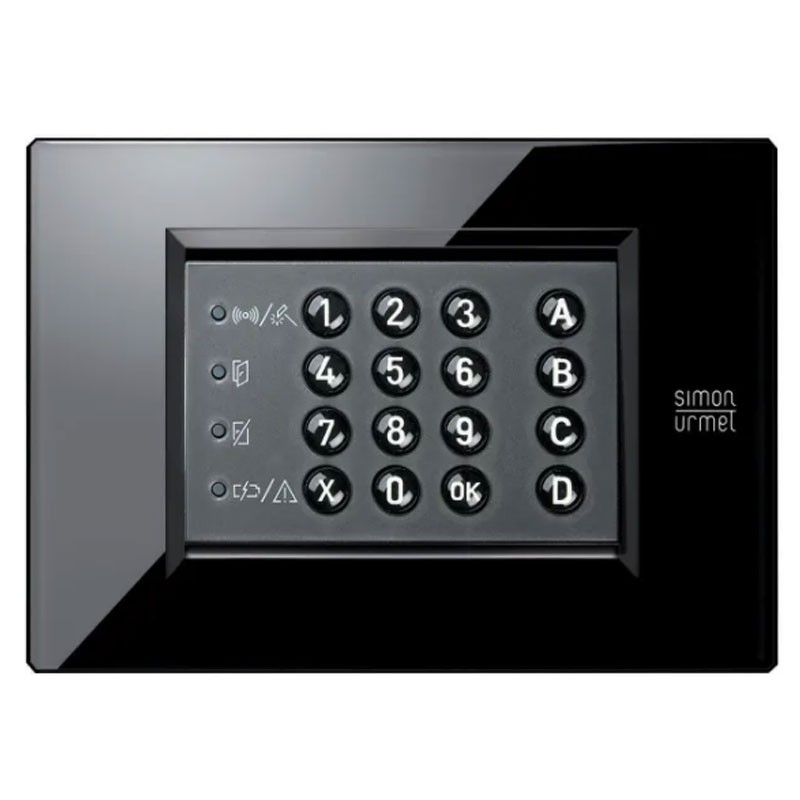 Tastiera di comando a LED Urmet, ad appoggio muro e ad incasso su serie civile Simon Urmet. IMQA 1 Liv. Numero max. di codici: 10 ( da 4 a 6 cifre). Connessione a 4 fili manomissione, funzione antirapina con digitazione codice programmabile.