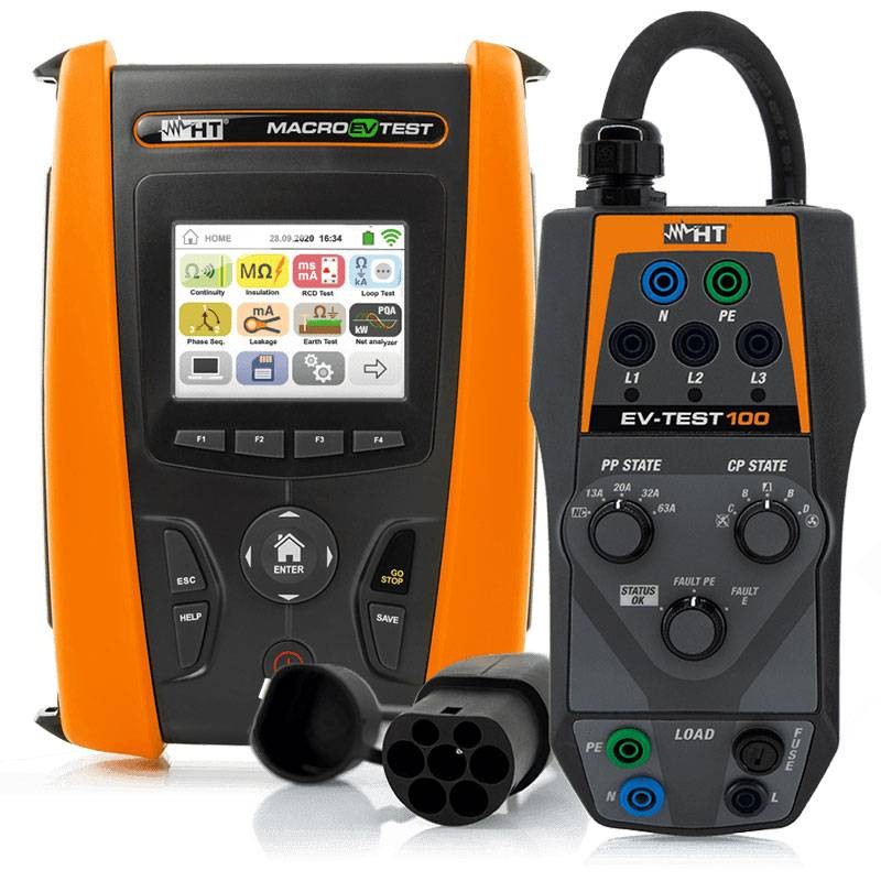 - MACROEVTEST è uno strumento multifunzione per la verifica e il controllo delle stazioni di ricarica delle auto elettriche (EVSE) in accordo alle normative IEC/EN 61851-1 e IEC/EN60364-7-722. Inoltre effettua anche tutte le verifiche degli impianti elettrici in conformità alla CEI 64-8: misure di Resistenza Globale di Terra, test su RCD di tipo A e AC fino a corrente nominale di 1A, e di tipo B fino a 300mA., Isolamento fino a 1000V, Continuità e correnti di corto circuito, misura e salvataggio di parametri ambientali (illuminamento, temperatura), della corrente di dispersione e delle grandezze elettriche potenza attiva, armoniche, fattore di potenza su impianti Monofase e non ultima la possibilità del controllo del senso ciclico delle fasi. Presente inoltre, relativa alla misura di Isolamento, la verifica del rapporto di assorbimento dielettrico D.A.R. e dell' indice di polarizzazione P.I. In aggiunta MACROEVTEST è in grado di connettersi all' App HT Analysis tramite la connessione WiFi integrata.