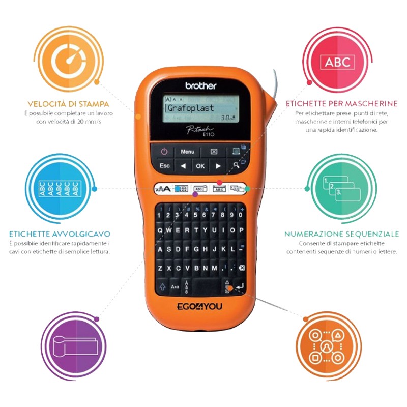 - Tasti funzione dedicati per una facile creazione di etichette specifiche Etichette generiche, etichette per mascherine, avvolgicavo, a bandiera per cavi